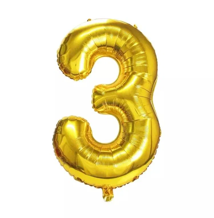 Die Zahl “3” als Luftballon in gold. Für eine Füllung mit Helium geeignet. Mit integriertem Ventil.